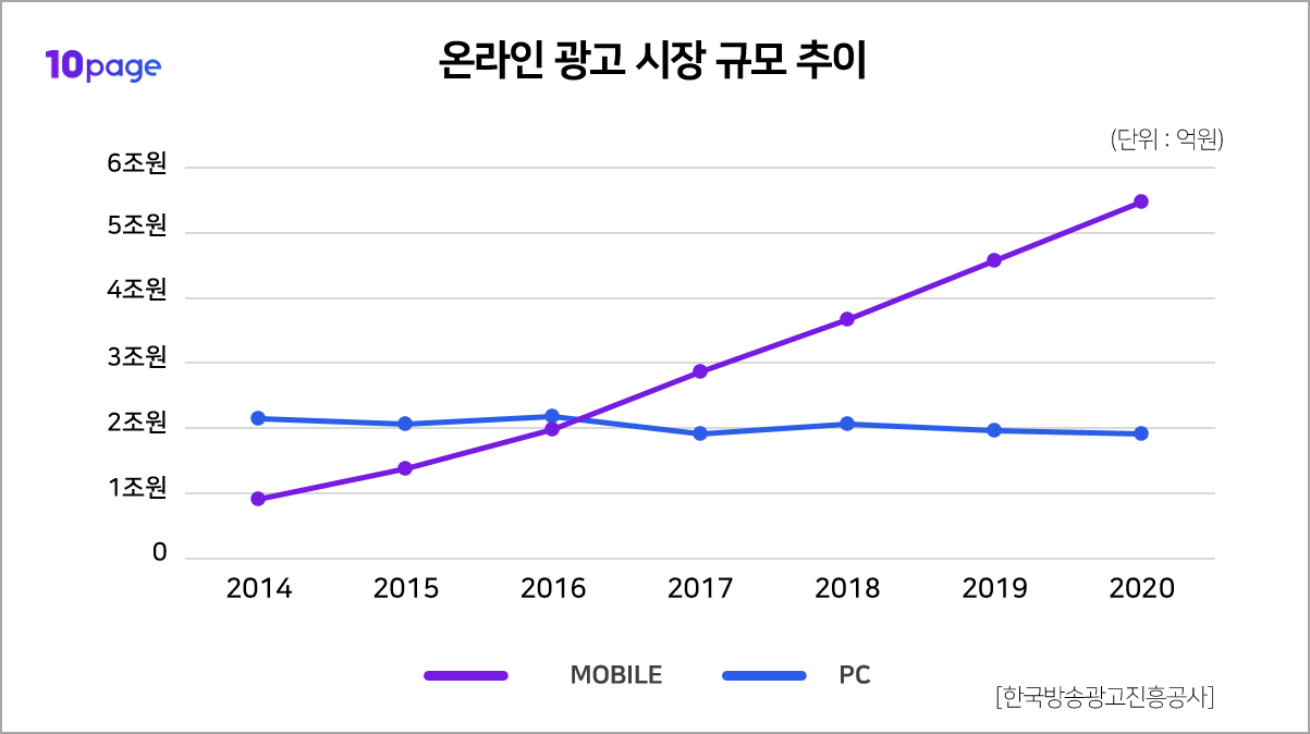 2016년 이후 Mobile 광고 규모가 PC 보다 커진 것을 확인할 수 있는데요.