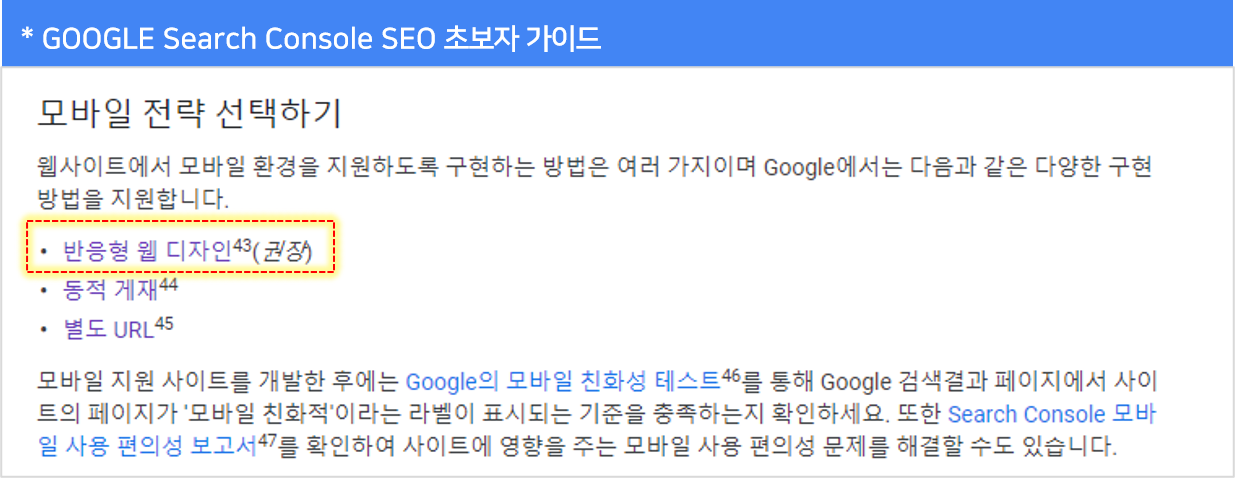두 사이트 모두 모바일 친화를 위해 반응형 디자인을 권장하고 있는 것을 확인할 수 있었습니다.