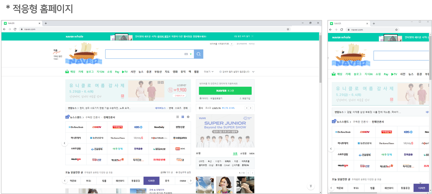 꼭 모바일 기기가 아니더라도, PC 웹브라우저의 크기를 조절하여 차이점을 확인할 수 있는데요.