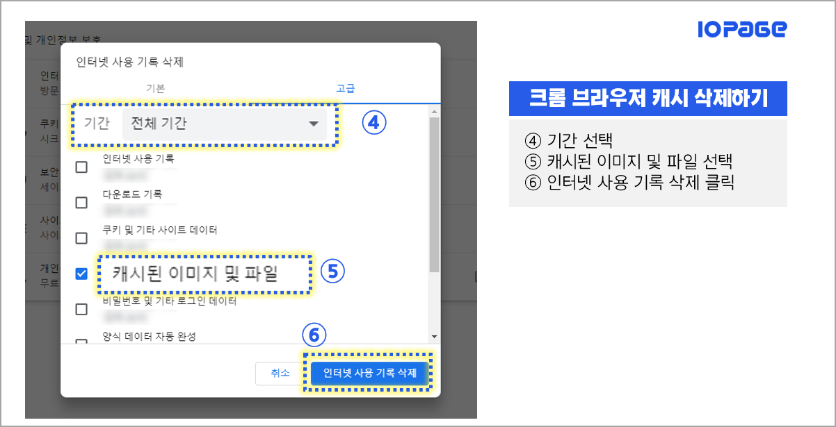 기간 설정 후 캐시된 이미지 및 파일을 선택하여 삭제하시면 됩니다.