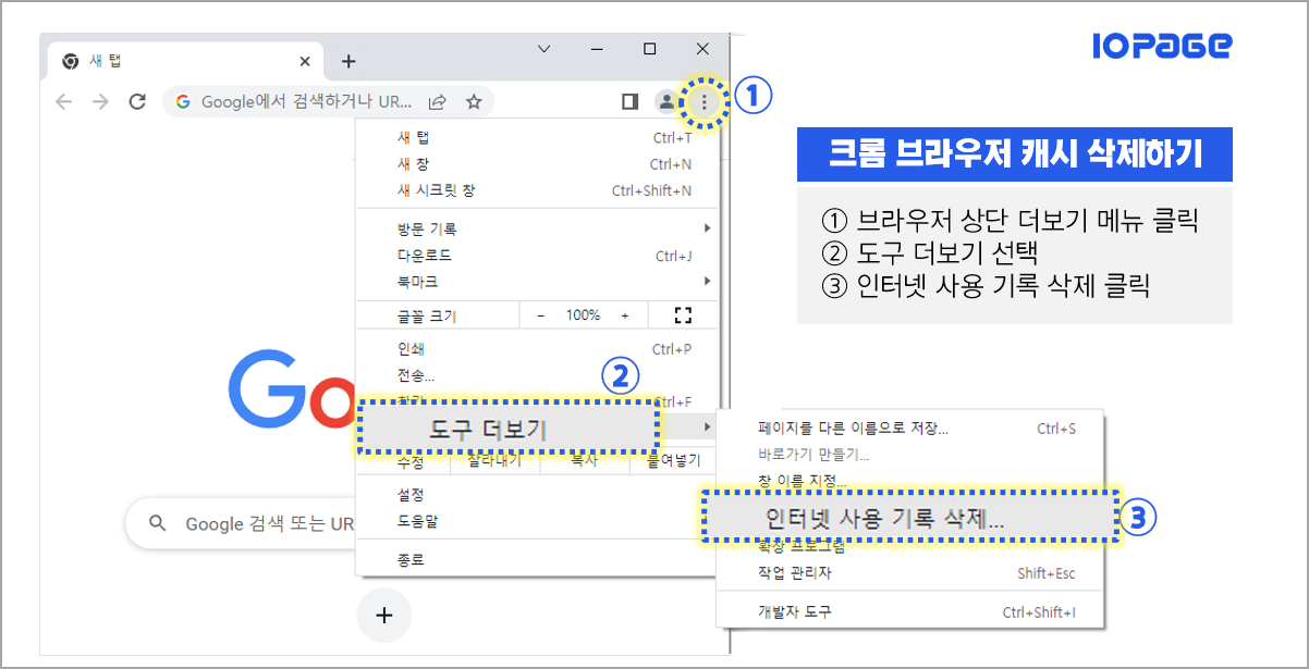 도구 더보기 > 인터넷 사용 기록 삭제를 차례대로 선택해주세요.