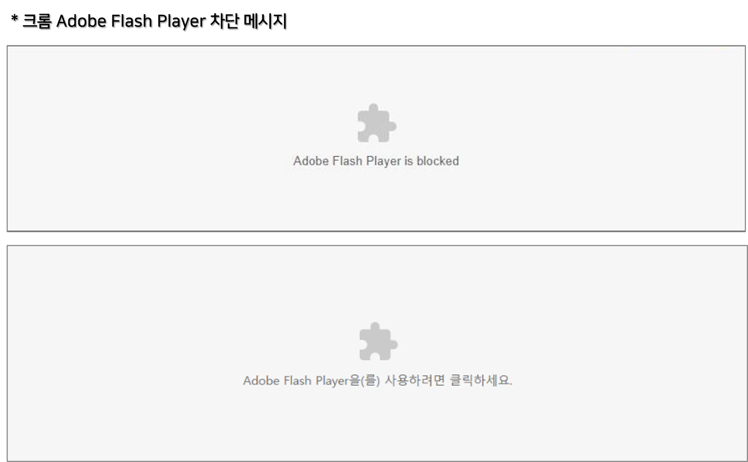 현재 크롬의 경우, 플래시 영역은 위와 같은 경고 메시지가 나타나는데요.